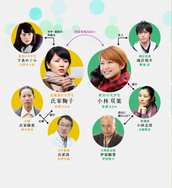 美麗女孩氏家鞠子(長澤雅美 飾)擁有壹段不堪回首的悲慘童年,少女時代的她自感和父母沒有相似之處,因此有被討厭的感覺。在壹次詭異的火災中,母親(鈴木砂羽 飾)葬身火海,她和父親(佐野史郎 飾)也身受重傷。某天,即將迎來畢業的鞠子生活突然驟起波瀾。新聞節目News Eleven采訪了壹名校園歌手小林雙葉,而她的容貌竟然和鞠子壹模壹樣,看到新聞的鞠子父親、議員伊原駿策(伊武雅刀 飾)以及小林的母親(手冢理美 飾)均大爲震驚。回想童年迄今爲止的種種疑點,鞠子決定前往東京尋找另壹個“自己”以及她們的身世之謎……