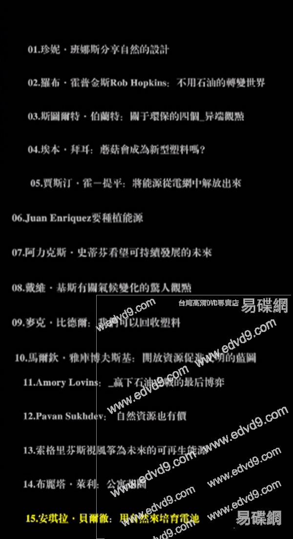劇情簡介: 劇增的汽油消耗量正不斷汙染著生態血脈。這一傷害可以逆轉嗎?這些TED演講者們正為我們斬開一條新的可持續發展道路。
