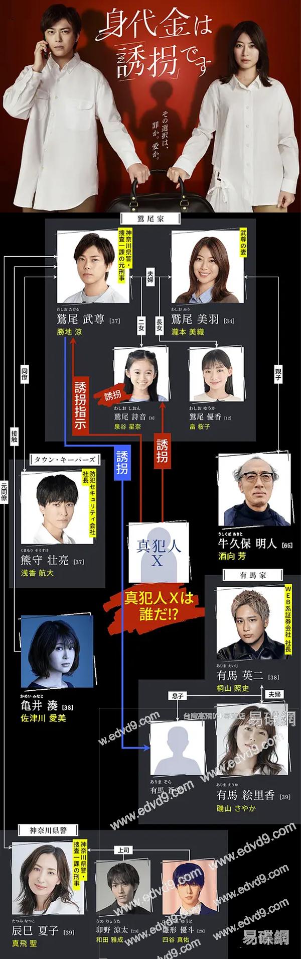 劇情簡介: 當一對夫妻的8歲女兒被綁架後,面對生死攸關的抉擇——是否為了救回女兒而去綁架他人孩子。 夫妻在犯罪帶來的痛苦與心理掙扎中,被逼至絕境,卻逐步逼近真凶。 父親鷲尾武尊由勝地凉飾演,他被迫犯下非己意的罪行; 母親鷲尾美羽由瀧本美織飾演,她始終把女兒放在第一位,成為家庭的精神支柱。