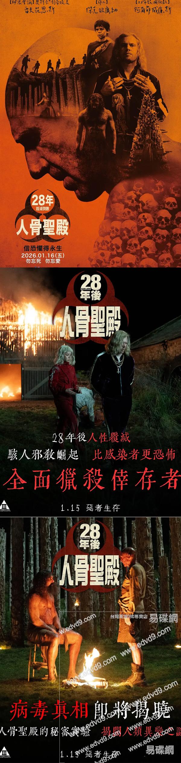 本片於2026年1月在臺灣院線上映 《驚變28年》三部曲之第二部《人骨聖殿》 在續作的世界觀中,感染者已非生存的最大威脅——幸存者喪失人性的行徑往往更加駭人聽聞 劇情簡介: 末日喪鐘再度敲響,帶領觀眾直視人性毀滅的煉獄,感染者的威脅和幸存人類的邪惡。。